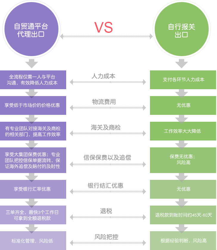 自贸通作为外贸综合服务平台,以国际贸易为载体,以互联网信息技术为手段,实现在线通关,外汇,物流,退税和信用保险等外贸业务一站式电子化全流程服务。从而实现外贸服务的信息化、标准化、透明化,并以规模优势、资源整合、服务集成等特质,大幅度降低传统外贸的服务成本。